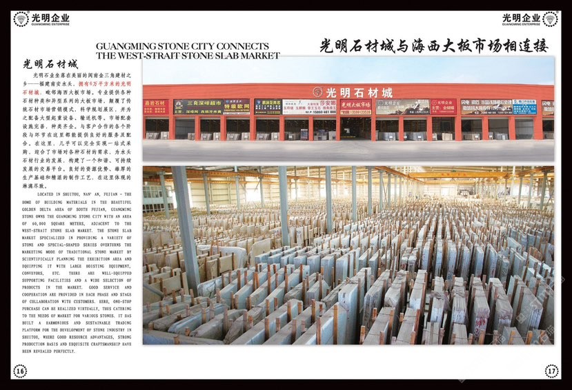 光明石业创建于1991年,历经二十多年发展投资,现已成为集金刚石刀具、矿山开采、多品类石材生产加工、大型工程承接、石材产业链生态平台为一体的多元化、跨地域大型石材集团,总注册资金近2亿元,占地几十万平方,员工上千人,是中国石材行业经营规模、加工水平、综合实力强的企业之一。旗下拥有多家子公司,包括南通新光明石业发展有限公司、锦明石业有限公司、新疆光明矿业、光明石材城。\\\\\\\\\\\\\\\ 公司主要生产加工国内外大理石、花岗岩、工程板、台板、异形线条及地铺石系列,目前拥有一系列先进生产设备,具备加工优质石材的能力,可加工各种规格平板、弧形及异形板,承包国内外多座大理石、花岗岩矿山,荒料库存达数十万立方,大板库存量达几十万平方,可承接国内外各种大型工程。多年来先后在北京、上海、浙江、天津、广东、江苏、湖北、四川、新疆、江西等地设立分公司,健全了公司的销售网络,使光明的品牌深入人心,产品深得广大顾客的一致好评。良好的信誉也使公司先后荣获“文明经营户”、“诚信单位”、“明星企业”、“石材之星”、“全国质量信得过产品”、“全国质量服务消费者满意企业”、“守合同、重信用单位”的荣誉称号,并通过了DHSAS18001健康管理体系认证、GB/TI9001-2000-ISO9001:2000质量标准和ISO14001:2004环境管理体系认证。\\\\\\\\\\\\\\\ 公司董事长黄明经先生担任全国工商联石材商会常务副会长、南安市第十五届政协委员、南安市石材协会常务副会长、水头镇商会会长。在新的世纪里,秉承诚信、优质、高效、服务的原则,黄明经先生将带领全公司齐头并进,为广大客户提供更多更好的产品,光明石业愿与广大客户携手合作,共创辉煌!