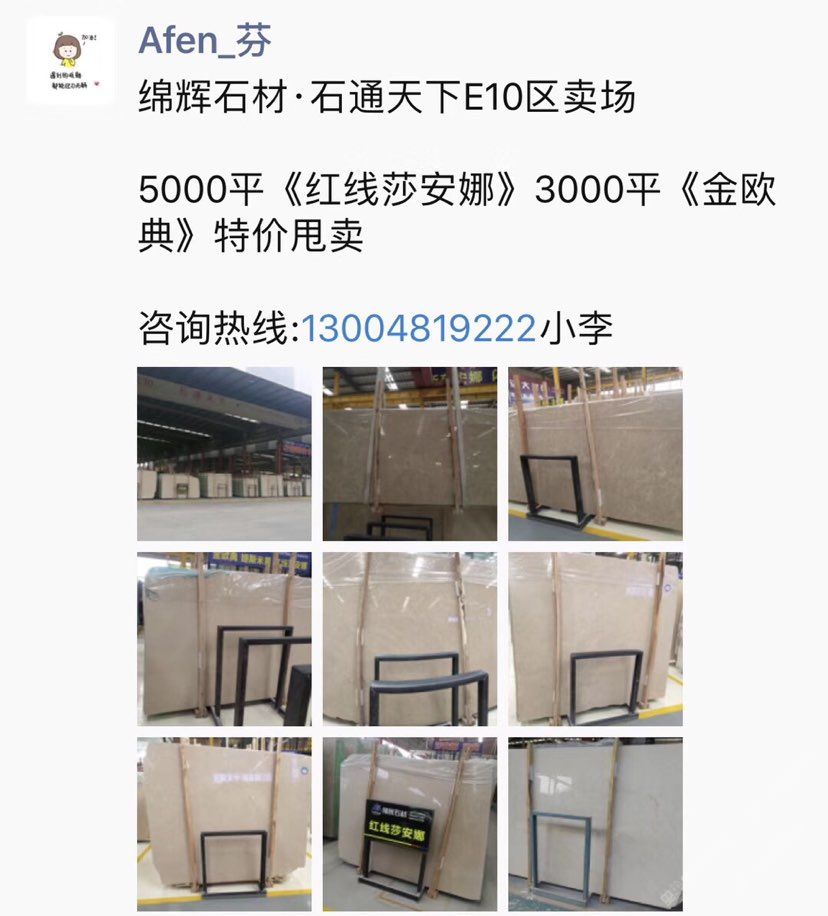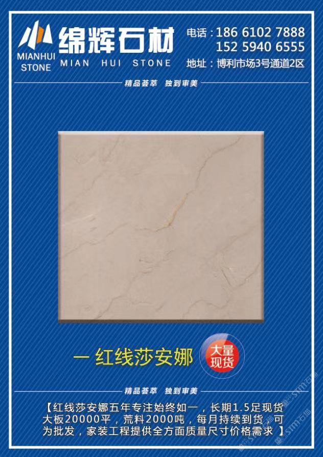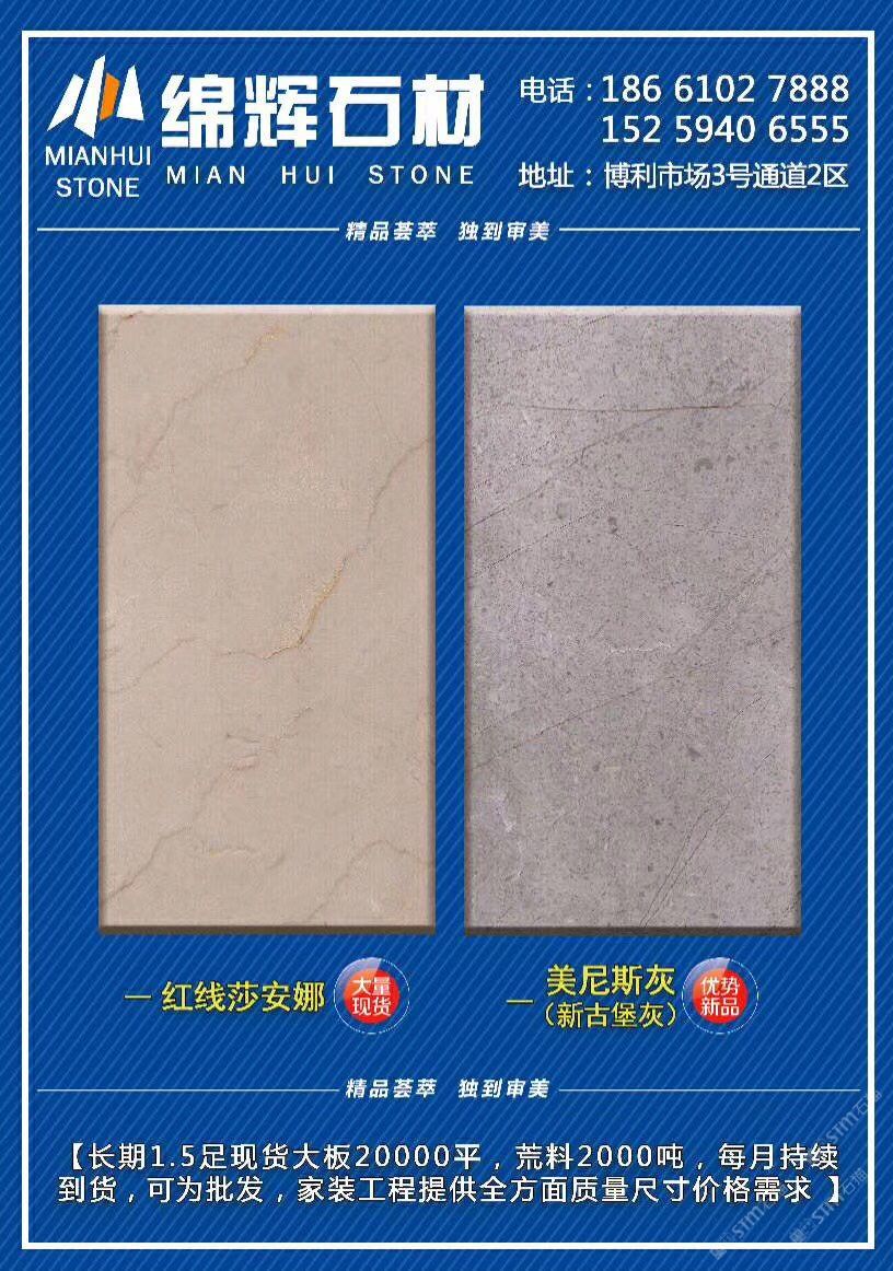 主营《红线莎安娜》《美尼斯灰·新古堡灰》《金欧典》,每月持续到货,日均库存大板20000平,荒料2000吨。可为批发,零售,工程单提供各种板面质量/规格/价位需求!