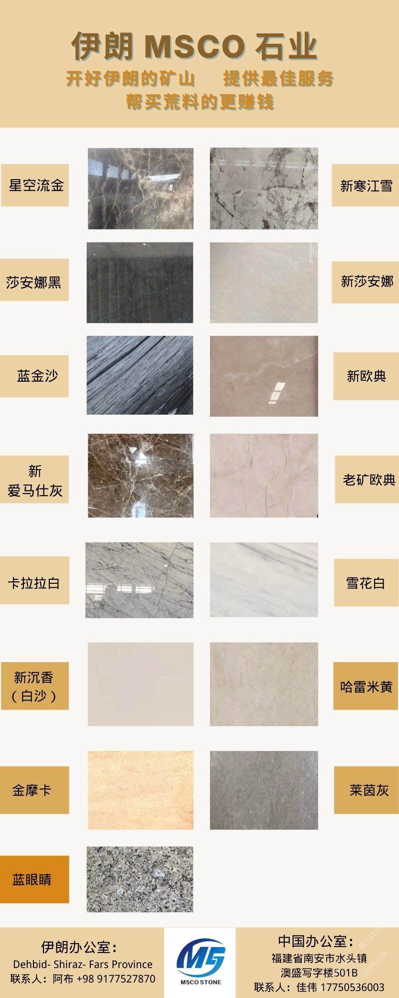 伊朗MSCO公司具备接近15年石材供应及矿山经营的丰富经验。目前我司在伊朗经营两座自有的大理石矿山,此外多年以来已包过近十座矿山。MSCO公司主营产品种类包括大理石,石灰石,花岗岩。对于伊朗新老矿品种感兴趣的企业老板们,欢迎随时联系咨询我。 水头办公室地址为 澳盛写字楼501B 17750536003微电