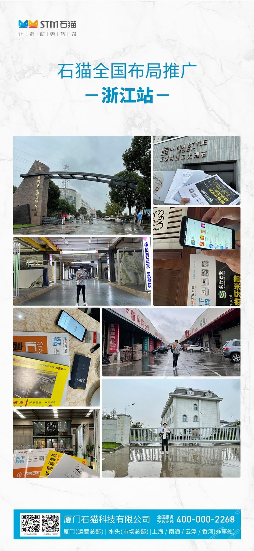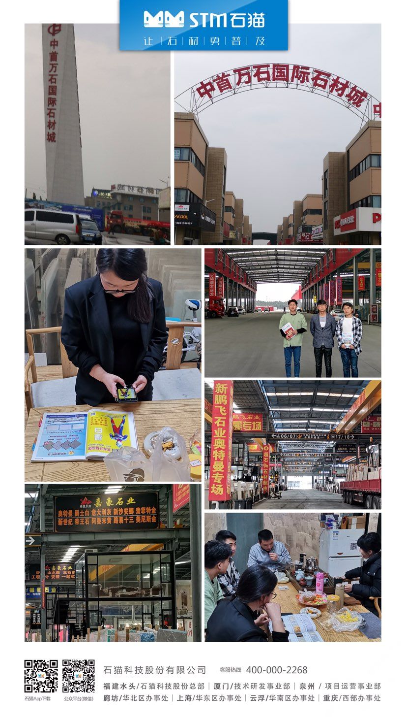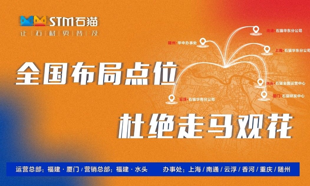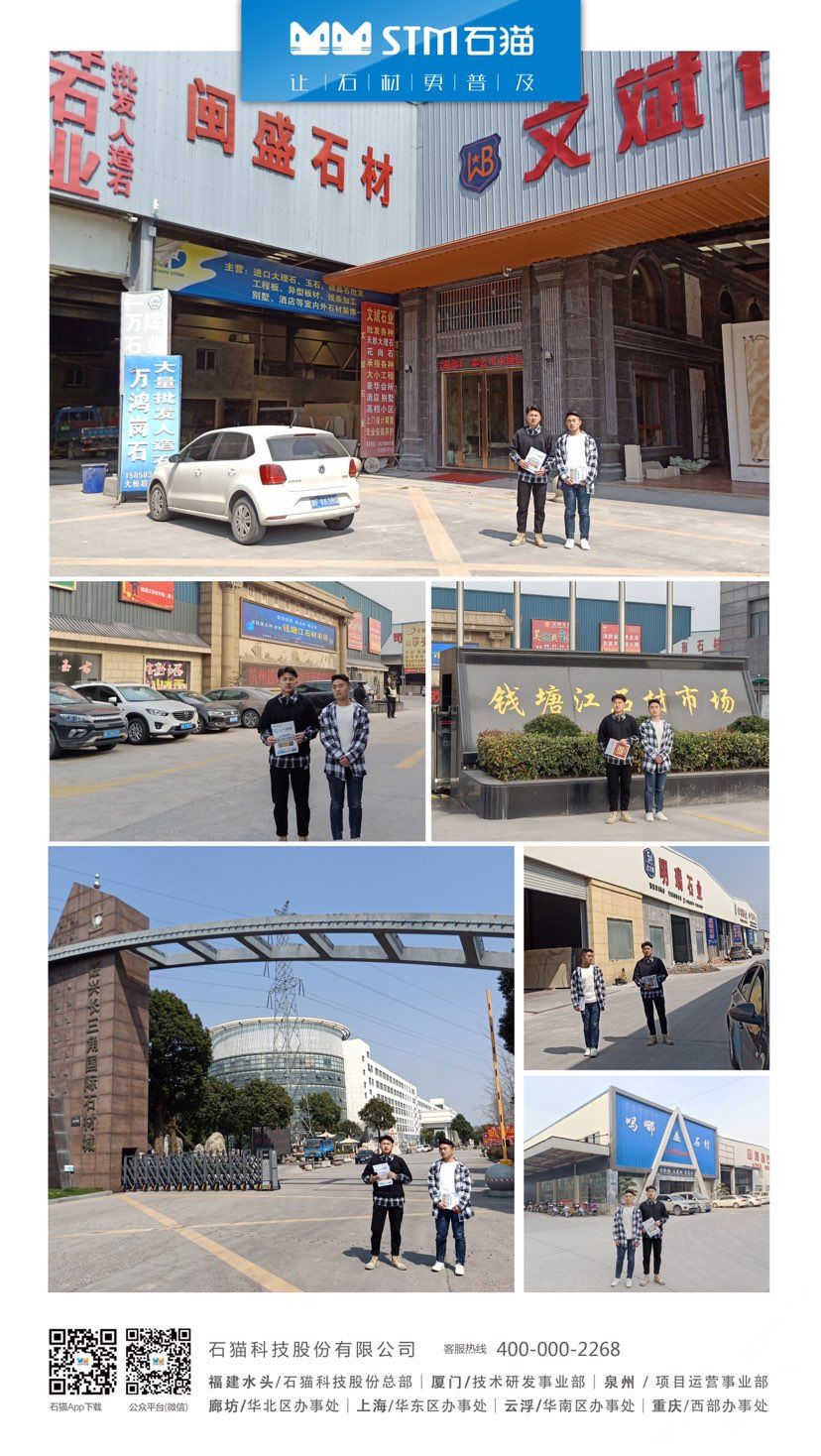 华东分公司先后与华东石材市场合作,包括上海东华环球石材市场、中首万石国际石材市场、南通东升产业园、六泉国际石材市场等,随后又与华东知名石材企业南通新景石材有限公司、隆川石材、康典石业、新鹏飞石业、宜兴隆嘉石业、新泽海石业、南通杰恒石业、珍品玉石合作,打造共赢局面。石猫致力于与各大优秀石企共同进步,共同发展,寻求石材行业新发展。