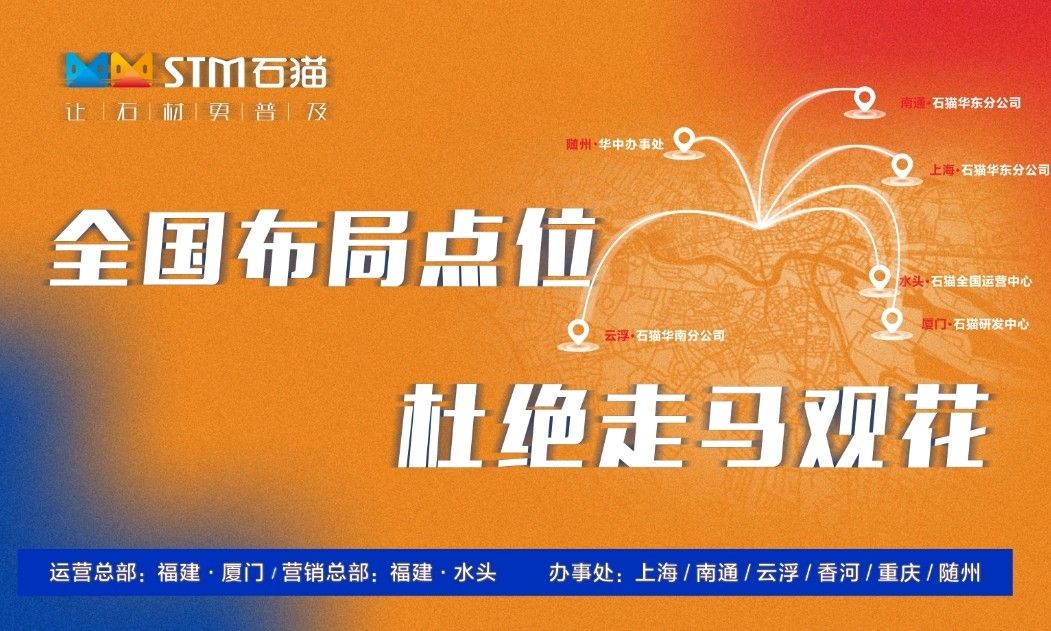 厦门石猫科技有限公司成立于2013 年,是一家专业的石材互联网科技公司,运营总部座落于美丽的海滨城市厦门,事业部设立在全球石材产业基地-中国福建水头;石猫通过战略布局,先后在华东、华南、华北、西部设立分公司,将步伐跨到国内各个区域的石材基地,实现从技术开发、营销推广、 广告服务、线上线下融合的全产业服务升级,为石材企业品牌推广及运营效率的提升,提供了全方位的互联网产品与服务。