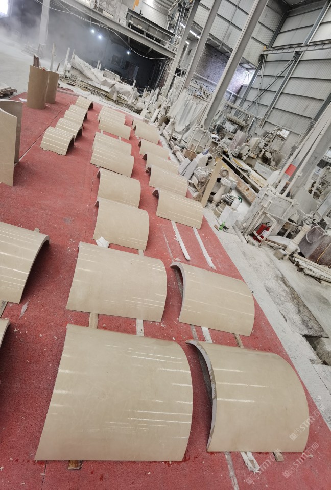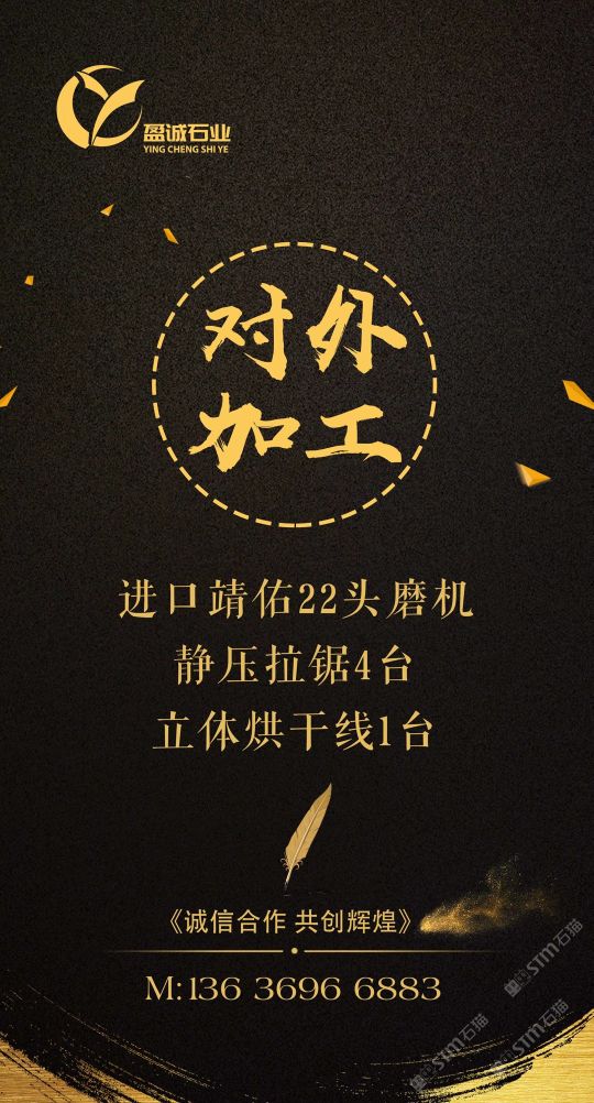 加工厂内设进口靖佑22头磨机,静压拉锯4台,立体烘干线1台。5台快锯、16头自动磨、3台中切机、双层补板线及烘干线、红外线桥切、倒角磨边机械、大型工程深加工,集设计、销售,加工一体化流水式作业。承接外墙干挂、园林铺地、异形加工、条板批发及出口订单。本公司一直坚持从矿山源头把关,为客户争取更大的品质与优势