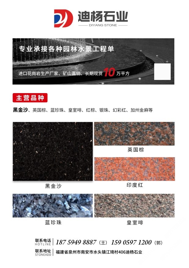 迪杨石业是一家专营进口花岗岩,集石材加工销售工程及出口贸易为一体的,主营黑金沙,印度红,皇室啡,英国棕,绿星,银珠,金钻麻等各种进口花岗岩,可承接外墙干挂,园林水景,地铺家装等各种异形加工,各种尺寸规格的大小工程单。欢迎来电咨询