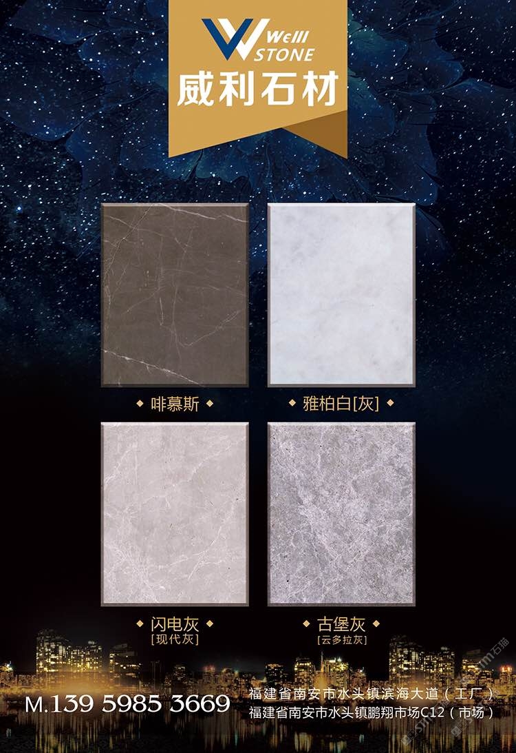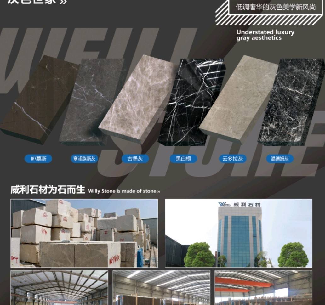 南安市威利石材有限公司成立于2008年,是一家集矿山开采、加工、销售、工程设计施工、进出口贸易为一体的综合型企业。我们不仅提供石材,更为您精心设计全套优质的石材解决方案。 威利石材专注于石材产品的矿山荒料直销、大板加工、大板展销、工程设计、工程配套施工服务 。公司主营啡慕斯、黑白根、塞浦路斯灰、古堡灰,爱马仕灰(温德姆灰),雅柏白,闪电灰多种优 质品种。公司已成为一家集专业化、产业化和规模化的工程材料采购、加工配套服务商。 威利石材以自己多年专业化和国际化的经营,与国内外矿山建立了良好的商业信誉和经贸合作关 系,赢得了国外矿山在中国区营销战略的全力支持。 威利石材依靠丰富的矿山资源,先进的管理、施工经验,坚持“以市场为导向、以技术为主体、 以质量为命脉、以效益为中心”,大胆探索,在技术进步、生产经营、企业管理、产品质量、售后服务等 方面始终走在行业的前列。并在信守“质量为准、信誉优等、服务为上”的企业精神指导下,产品畅销世 界各地,深得消费者的信赖和赞誉。我们时刻把握时代脉搏,走在市场前沿,挥洒石材文化,增添人类辉煌。多年来我们一直致力于服务质量的提高。“顾客为上”、“追求圆满”已经融入到公司的企业文化、经营 理念当中,并且在产品生产、过程服务、售后追踪等具体工作中得到落实。 我们的追求——集世界美石,为中国添彩!\