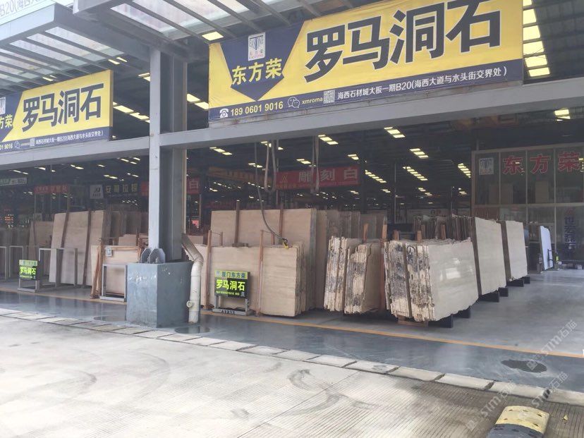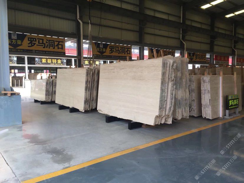 罗马洞石专场,大量各种规格的荒料和大板。