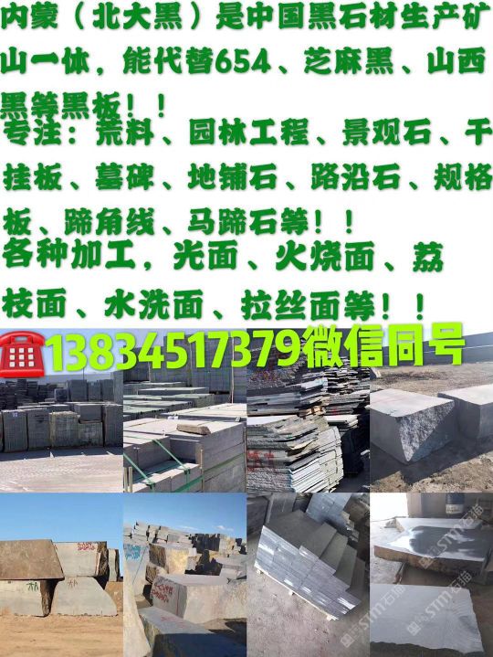 发布信息: 蒙古(北大黑)是中国黑石材生产矿山一体、能代替654,芝麻黑,山西黑:等黑板 ※诚信为本 专注:荒料,园林工程,景观石,干挂板,墓碑、地铺石、路沿石、规格板、蹄角线,马蹄石。 各种加工、光面、火烧面、荔枝面、水洗面、拉丝面等等! 电话:13834517379微信同号