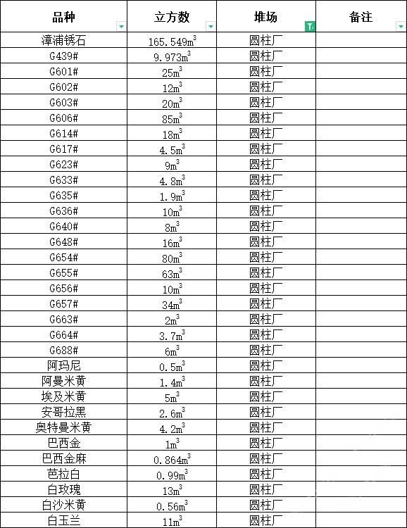 发布信息: 鸿源圆柱 ,大量荒料处理, 联系电话:13506960182 漳浦锈石、G439#、G601#、G602#、G603#、G606#、G614#、G617#、G623#、G633#、G635#、G636#、G640#、G648#、G654#、G655#、G656#、G657#G663#、G664#、G688#、阿玛尼、阿曼米黄、埃及米黄、安哥拉黑、奥特曼米黄、巴西金、巴西金麻、芭拉白、白玫瑰、白沙米黄、白玉兰