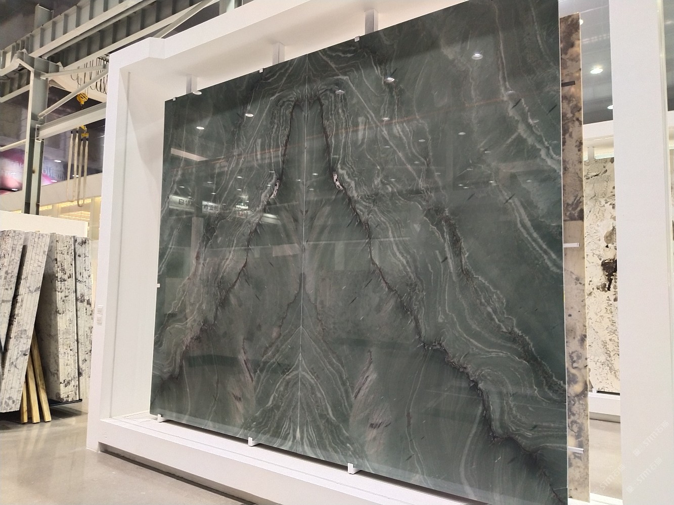 新正大奢石馆[奢石品牌]龙纹绿背景墙山水画。
