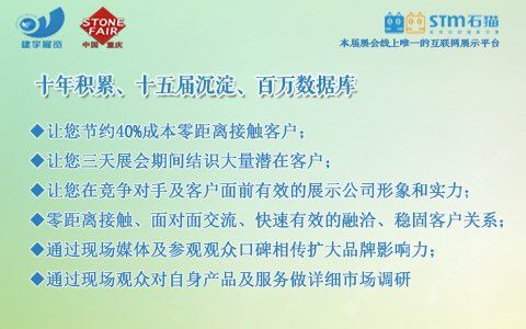 发布信息: 【2018第九届重庆石材展5月在渝举办!】 主办:重庆市工商联(总商会)建材商会、重庆建宇展览有限公司 时间:2018年5月10-12日 地点:重庆国际会议展览中心 【往届回顾】 上届展会有来自国内外近600余家知名企业和品牌参展,展示面积25000平方米,共接待了包括开发商、建筑商、承包商、装饰设计、代理商、经销商等专业人士近3万人次,被业界誉为中国西部地区专业性强,参展效果的行业盛会之一!同时也得到了重庆市政府部门及行业主管部门的大力支持和指导。 【参展范围】 石材类:大理石/花岗石/砂岩荒料、石灰石、板岩等 板材类:天然石材/大理石/花岗石板材、环境石材 人造石类:人造石英石、人造文化石、人造石板材 石雕制品类:石雕、石刻制品、园林风景石、假山石等 环境装饰类:卵石、仿古石、景观石、磨菇石等 石材机械及加工设备:金刚石串珠锯、研磨抛光设备、水射流切割机等 养护材料及设备:石材养护用品及设备、各类石材清洗、研磨剂、石材抛光剂等 【为什么选择-建宇·建博会—十年积累、十五届沉淀、百万数据库】 ?节约40%成本零距离接触客户 ?三天展会期间结识大量潜在客户 ?在对手及客户面前展示公司形象和实力 ?快速有效的融洽、稳固客户关系 ?通过现场媒体及观众口碑相传扩大品牌影响力 ?通过现场观众对产品及服务做详细市场调研 【联系方式】 单 位: 重庆建宇展览有限公司 电 话: 023-86376000/62925058 传 真: 023-86376218 e-mail: jianyuzl@163.com 地 址: 重庆市南岸区南坪西路3号商业大楼29-4