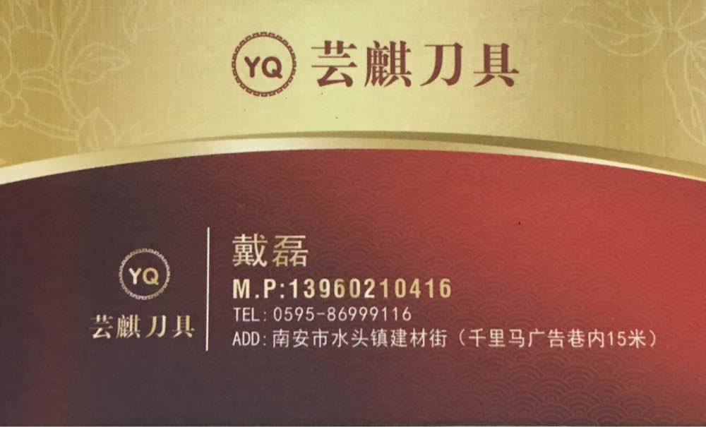 芸麒刀具 联系人:戴磊    139****0416 查看 手机号码:无 主营范围: 其他、 企业地址:福建南安水头镇建材街千里马广告巷内