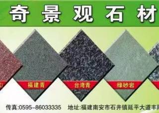 树奇景观石材主营产品:福建青,漳浦青G612,台湾青,森林绿,红斑岩,绿斑岩,紫斑岩,寿宁红,红砂岩,蝴蝶绿,锈石,黄金麻,菊花黄,皇室香槟(老矿),高湖石,老石板(旧石板)企业地址:福建泉州南安市石井镇延平大道丰隆加油站旁