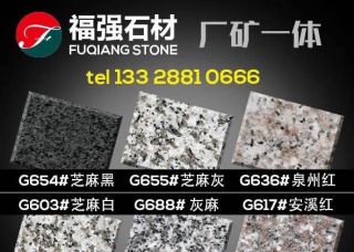 长泰县福强石材厂主营产品:芝麻黑,芝麻白,芝麻白(火烧面),芝麻白(荔枝面),芝麻灰,芝麻灰1,芝麻灰2,G654,G654芝麻灰,G654(自然面),新G654,新G654(1),芝麻黑654(火烧面),芝麻黑654,新617,G617,新G623,G688,漳浦红G648,G655,G655 (1),G655(荔枝面),G655(火烧面)1,新G655,长泰G655,芝麻灰(江西),芝麻灰655(火烧面),乔治亚灰,福建灰麻,福建灰麻(亚光面),福建芝麻黑,乔治亚灰(深色),灰麻1,金点灰麻2,金点灰麻1,新芝麻黑(火烧面),新芝麻黑(光面),芝麻黑(荔枝面),芝麻黑654(新矿),G655(漳州矿),芝麻白(603),芝麻白G603,G603,泉州红,G636,G636(福建矿),G606(砻石),G606(正矿),黄锈石,柬埔寨芝麻黑企业地址:福建泉州南安市石井镇林柄村江锋石材厂