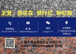 广西岑溪市恒强石业主营产品:海浪花(浪花白),浪花白1,浪花白(海浪花),浪花白,枫叶红(荔枝面),枫叶红(菠萝面),枫叶红(斧剁面),枫叶红(火烧面),枫叶红,粉红麻2企业地址:广西岑溪归义镇恒强石业
