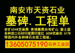 福建省长泰县怛毕墓碑石材厂主营产品:蒙古黑,新蒙古黑,青石,福建青(青石),四川青石,深芝麻黑,福建芝麻黑,芝麻黑,芝麻黑654,黄锈石,哈密金麻(黄锈石),山西黑,新山西黑,海南黑,福建红,福建黑,福建青,福建白麻,芭拉白(福建新矿),樱花红(福建),安哥拉黑金,中式石栏杆企业地址:福建漳州长泰县林墩工业区