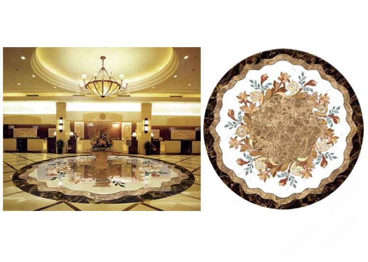 描述:石材水刀拼花是目前市场上最常见的水刀拼花,是利用水刀将各种颜色的石材切割成需要的造型,再用胶水拼接而成。大理石,花岗岩,玉石和人造石都是很好的材料选择。现阶段石材拼花主要应用在星级酒店,大型商场,别墅,家装的客厅,餐厅和玄关,是目前石材装饰中效果最好最为绚丽高贵的装饰产品。